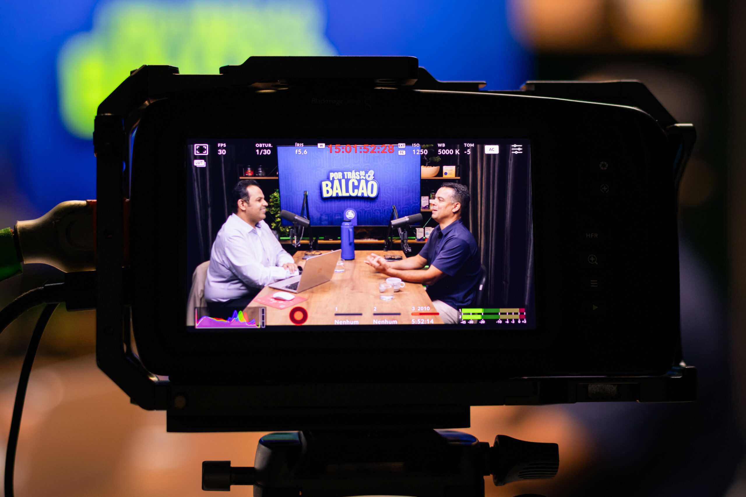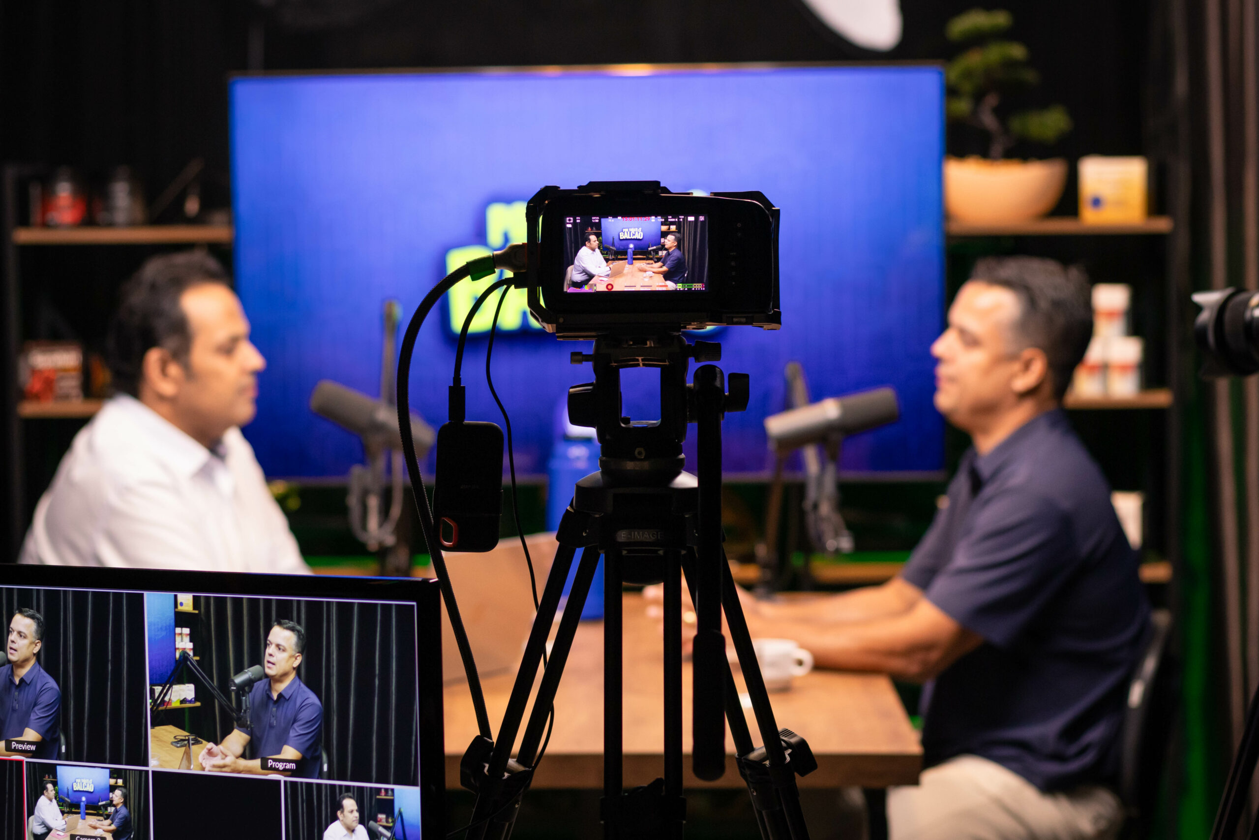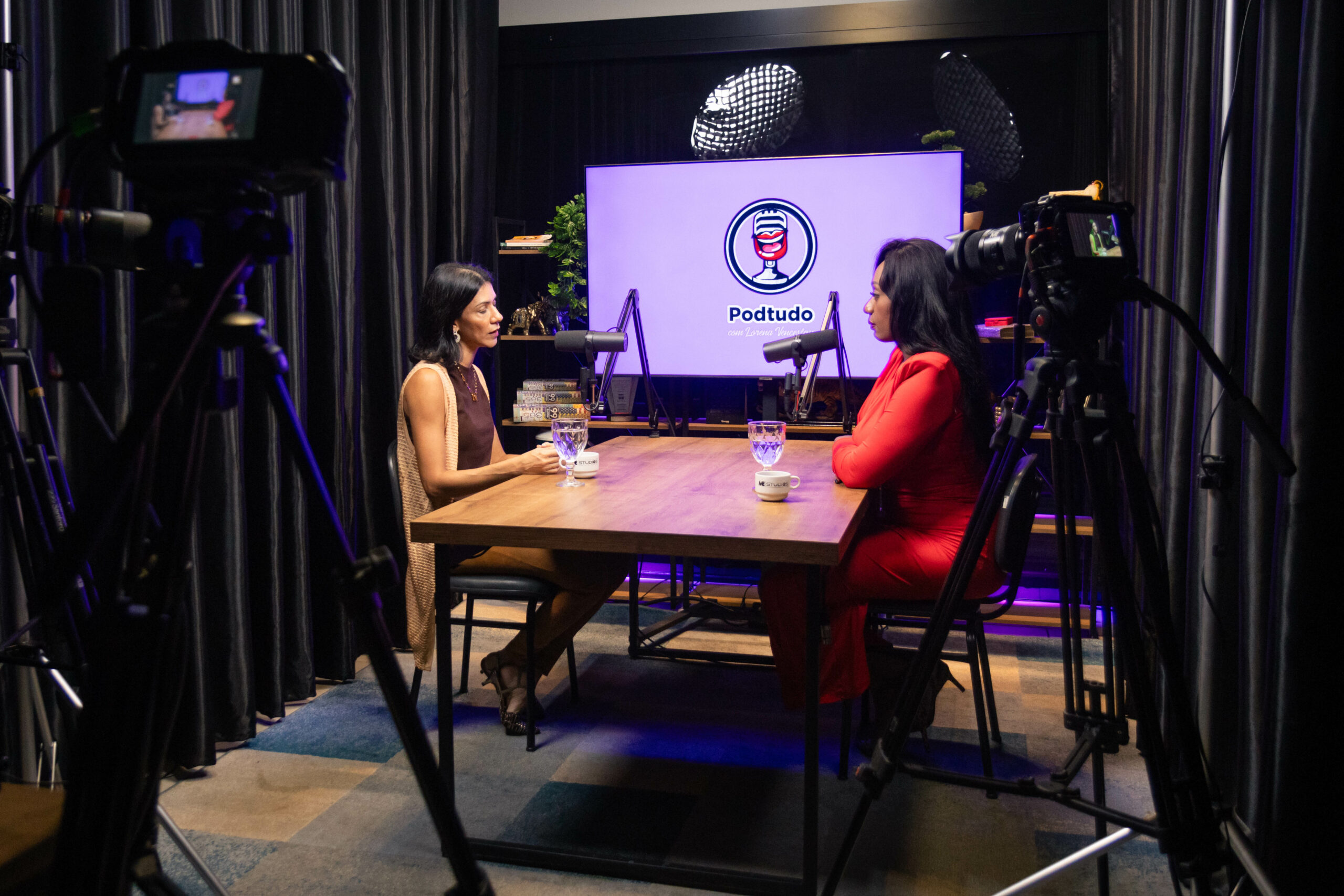 Estúdio com estrutura completa para você gravar seu podcast ou videocast em um ambiente climatizado e confortável.